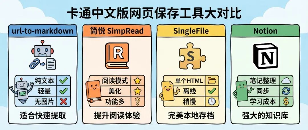 "Markdown是程序员的母语,url-to-markdown就是我们的翻译官。" "简悦不只是保存,更是一种阅读方式的革命。" "SingleFile给你完整的世界,其他工具给你精简的精华。"