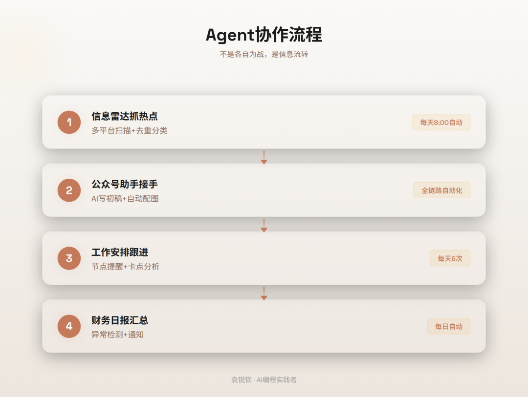 这8个Agent不是各自为战。信息雷达找到好选题,公众号助手自动接手写文章。财务日报发现异常数据,系统管理会通知我。它们之间有信息流转。