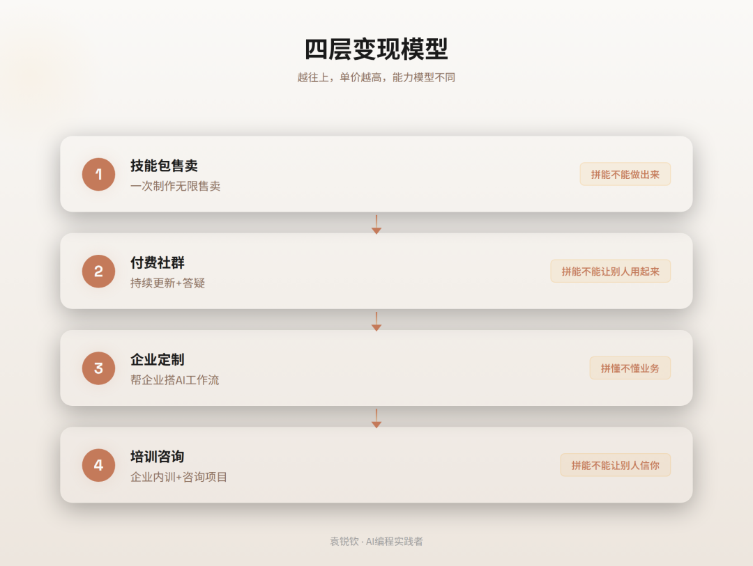 四层模型的核心逻辑:越往上走,单价越高,但需要的能力模型不同。底层拼的是"能不能做出来",中层拼的是"能不能让别人用起来",顶层拼的是"能不能让别人信你"。