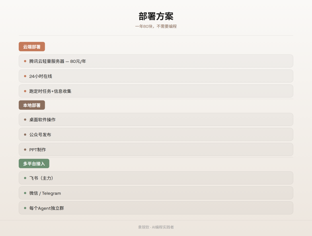 需要操作桌面软件的场景(比如自动发公众号、做PPT),用本地部署。本地电脑上跑一个节点,跟云端服务器联动。云端负责7×24在线的任务,本地负责需要图形界面的操作。