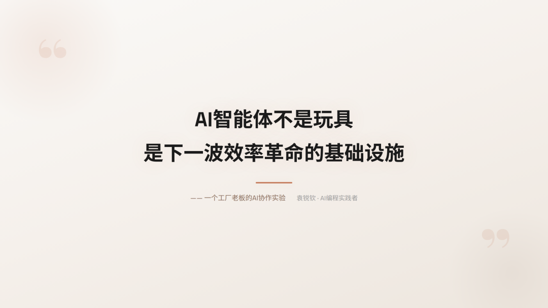 但我知道一件事:AI智能体不是玩具,是下一波效率革命的基础设施。就像2015年你不学公众号运营会错过红利,2020年你不学短视频会错过红利。现在你不搭自己的AI协作体系,明年就会发现自己被用AI的人甩开。