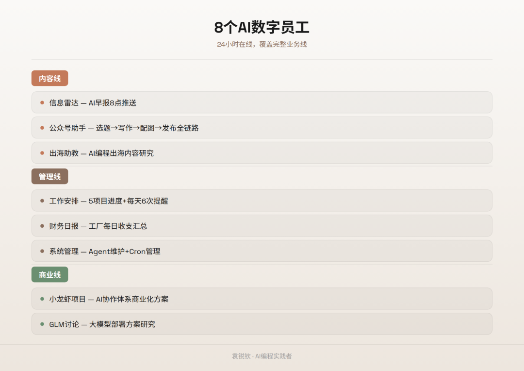 现在,我有8个AI智能体在同时运行。它们24小时在线,分别负责信息收集、内容创作、财务管理、项目推进、出海研究、商业方案、技术调研和系统协调。
