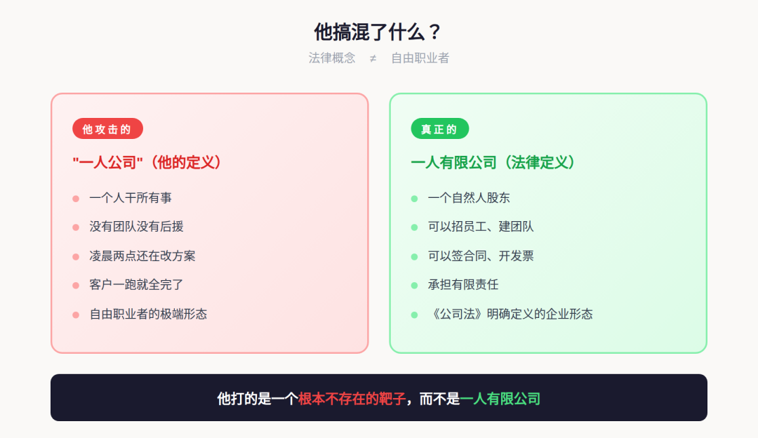 作者把"一人有限责任公司"和"超级个体/自由职业者"混为一谈了,然后狠狠地打了一个根本不存在的靶子。