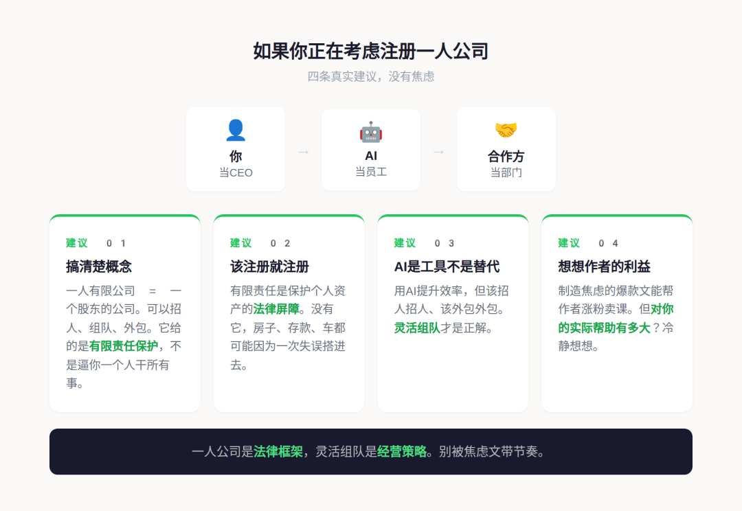 3. AI是工具,不是替代品。 用AI提升效率,但该招人的时候招人,该外包的时候外包。一人公司是你的法律框架,灵活组队是你的经营策略。