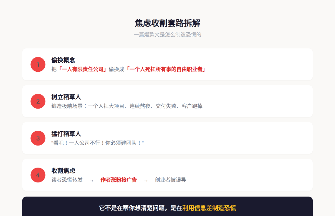 这种写法的问题在于:它不是在帮创业者想清楚问题,而是在利用信息差制造恐慌。