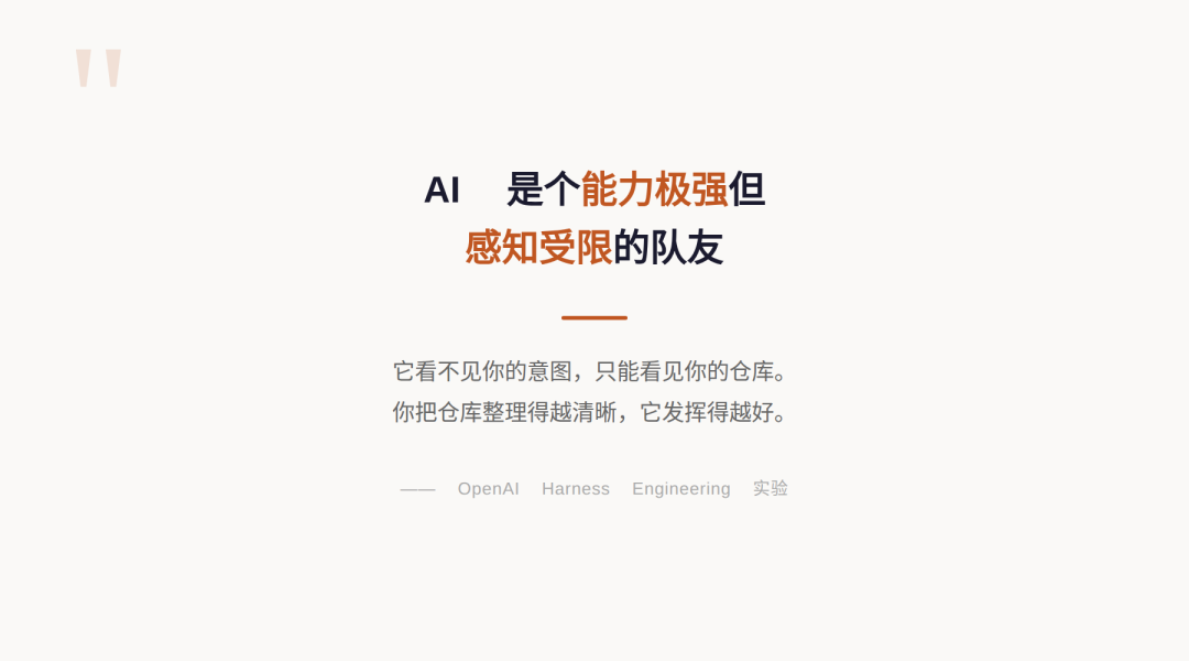 工具缺失、文档混乱、结构不清晰——这些"人类勉强能接受"的环境,对 AI 是致命的。AI 没法靠直觉补全信息,没法靠经验猜测意图,它只能用它能"看到"的东西。