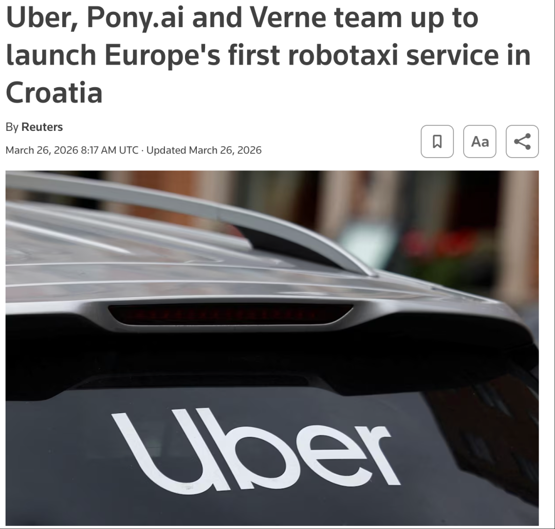 事件/产品:路透社报道,Uber 与 Pony.ai 以及克罗地亚初创公司 Verne 合作,将在首都萨格勒布推出欧洲首个商用机器人出租车服务 。