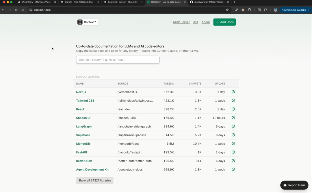 McKay 演示了连接一个名为 Context7 的 MCP 服务。这个服务专门提供最新的软件库文档。他只需要在终端里向 Claude Agent 提问,智能体就会通过 Context7 获取最准确的 API 信息,并直接写入笔记。