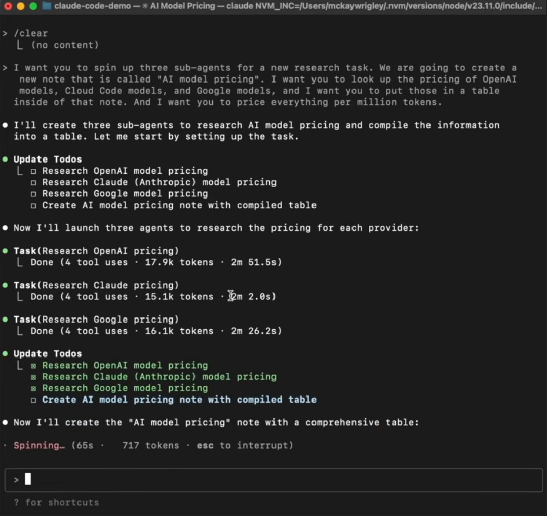 比如,你可以说:「请启动 3 个子智能体,分别去网上查找 OpenAI、Anthropic 和 Google 最新大模型的定价,并以每百万 token 价格为标准,将结果汇总到一个表格里。」