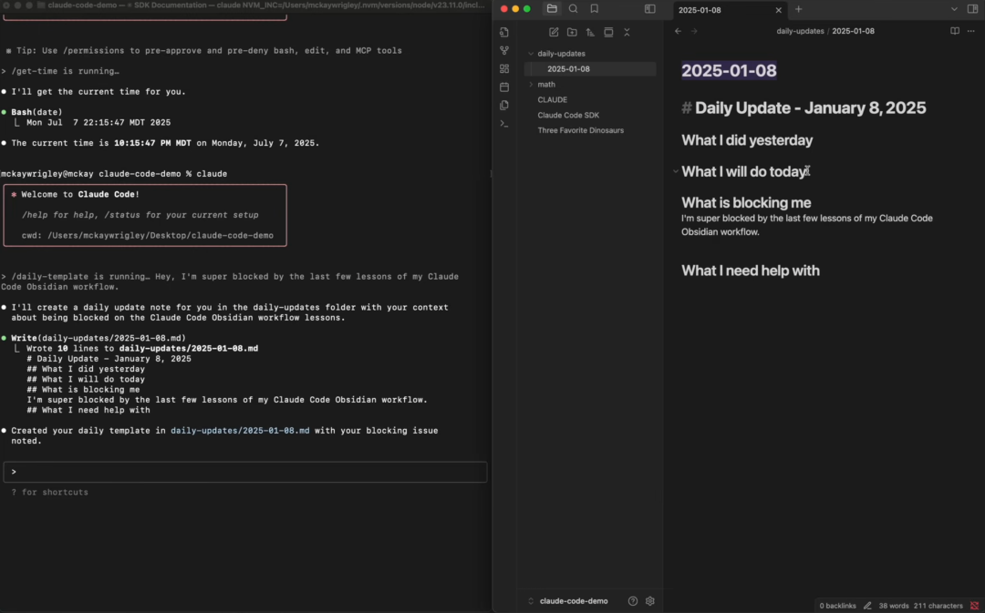 现在,只需要在终端里输入 /daily-template,然后用语音说出今天的待办事项,AI 就会自动在指定位置,用预设好的格式,创建一篇包含口述内容的全新日报。