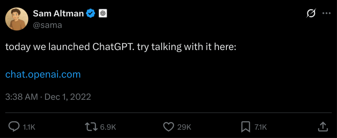 2022 年 11 月 30 日,Sam Altman 随手发了一条推文,向世界介绍了这个「小玩意」。