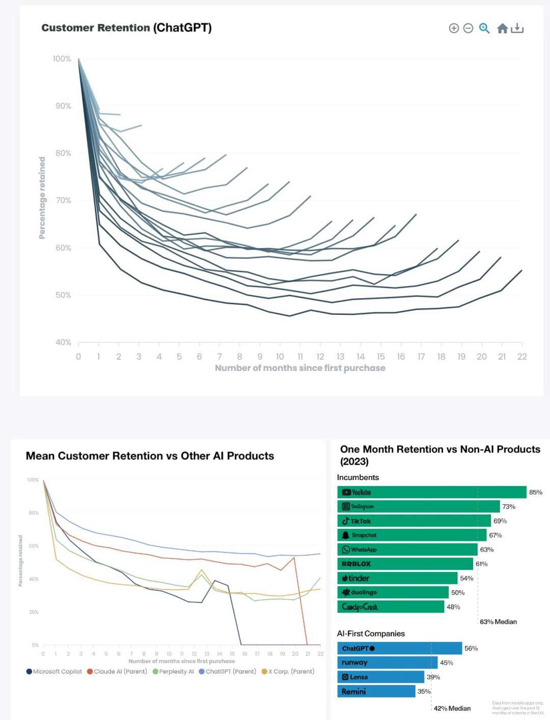 通常,一个产品用户基数越大,后续用户的质量和留存率会自然下降。但 ChatGPT 打破了这一定律,即便在用户从早期极客扩展到普通大众后,其留存率依然坚挺,甚至不断提升。