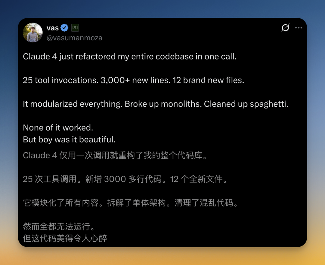 有开发者分享:他仅仅用一次调用就让模型重构整个代码库——25 次工具调用、3000 多行新代码、12 个新文件。