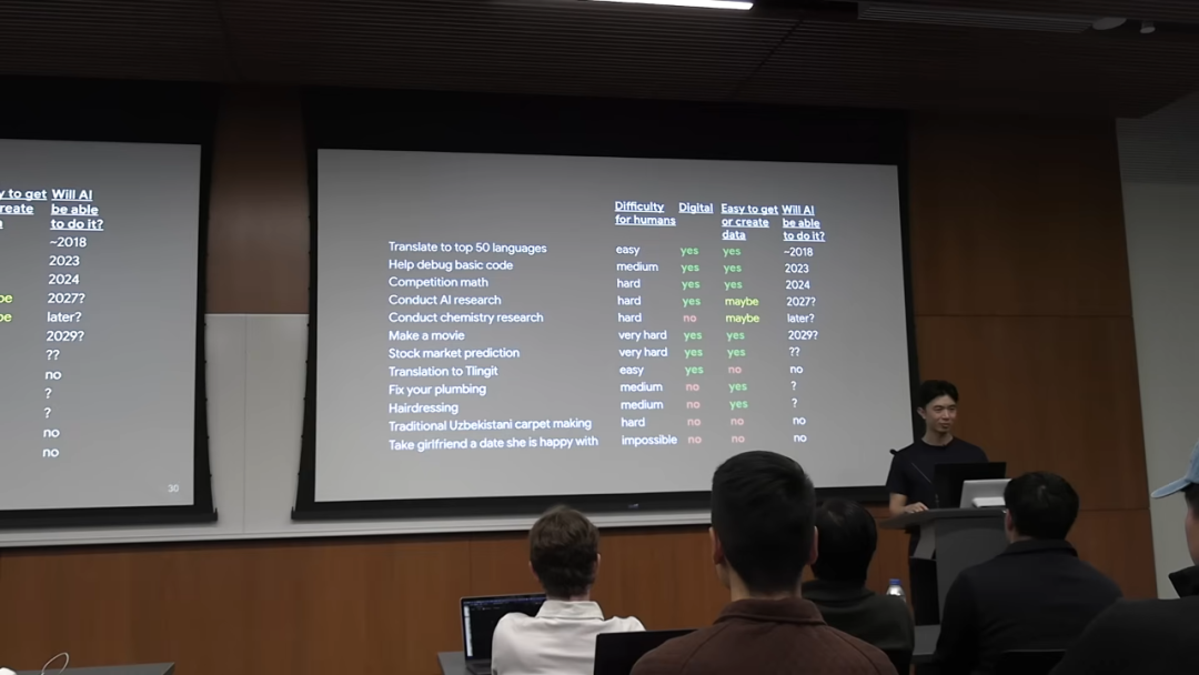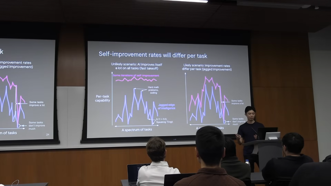 ChatGPT 会认为 9.11 比 9.9 大。另一个例子是说特林吉特语 (Tlingit),这是一种只有几百名北美原住民会说的语言,由于数据极度稀缺,AI 几乎不可能学会。更重要的是,不同任务的提升速度也是不同的。那些位于「高峰」的任务,可能会因为其高度可验证性而得到算法的快速优化,变得越来越强。而那些位于「深谷」的任务,其瓶颈可能在于物理世界交互或数据采集,提升速度会非常缓慢。AI 不会因为在数学上取得了突破,就突然学会了如何说一口流利的特林吉т语。