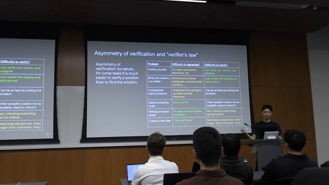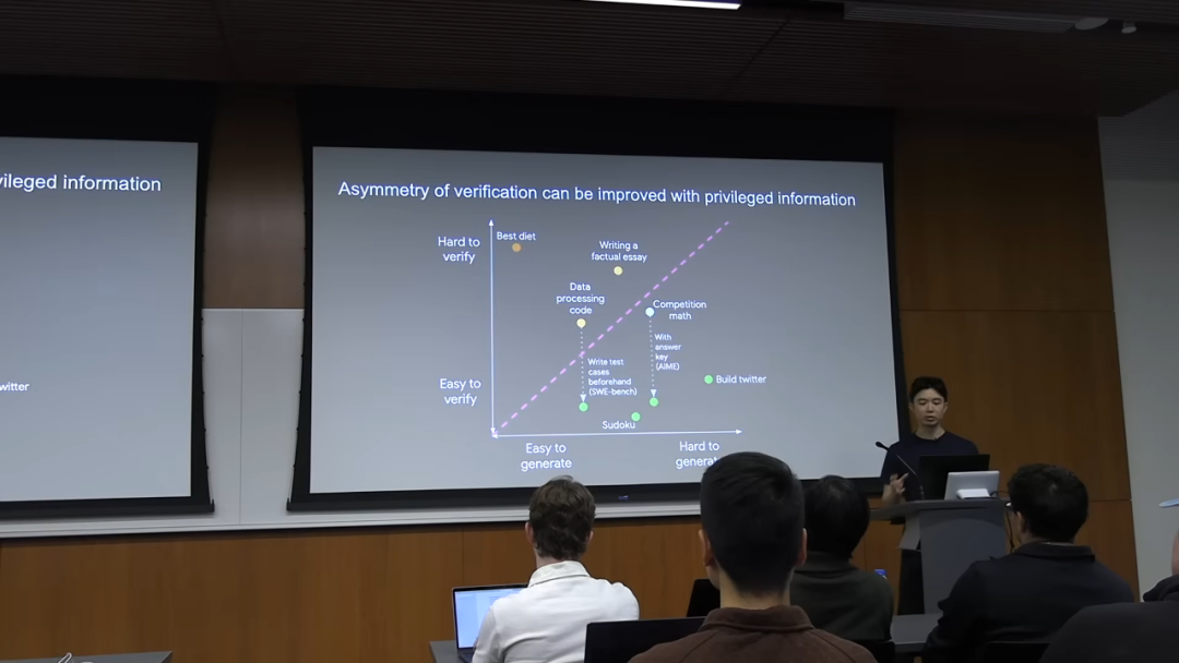 一个有趣的点是,我们可以通过提供「特权信息」(privileged information) 来改变一个任务的验证难度。比如,对于数学题,如果提供了答案和解题步骤,验证就变得非常容易。对于代码,如果提供了完整的测试用例,验证也变得轻而易举。