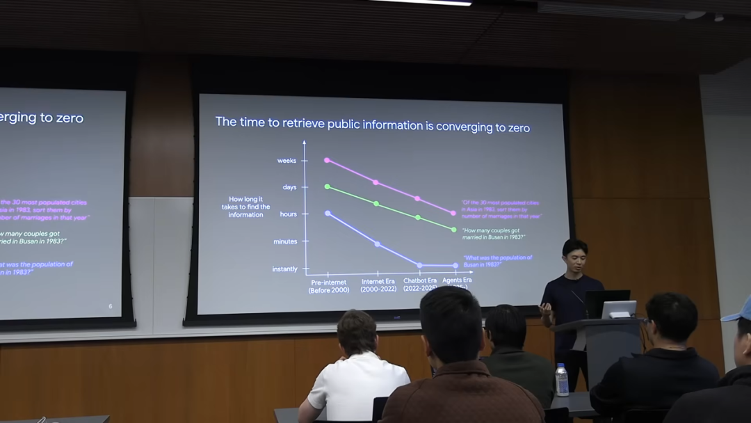 但在今天的「AI 智能体」(Agents) 时代,这个问题可以在几分钟内解决。Jason 提到,GPT-3 无法回答这个问题,但 OpenAI 的内部研究工具 Operator 可以。它能够自动访问韩国统计信息服务 (KOSIS) 数据库,通过多次点击和尝试,构建正确的查询语句,最终找到答案。