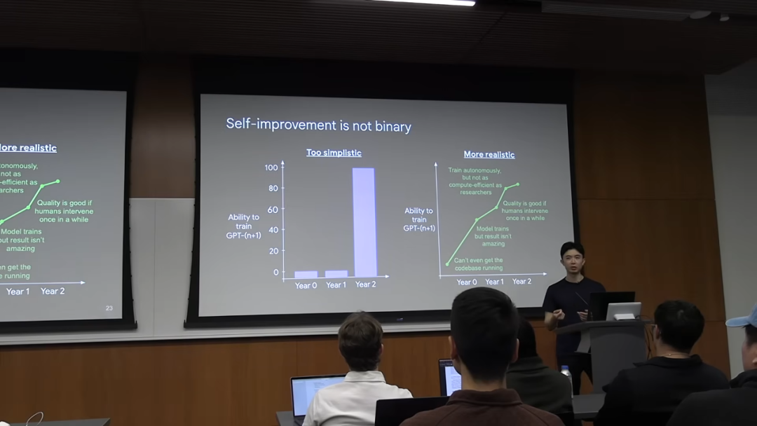 他的理由是,AI 的自我提升能力更可能是一个渐进的、连续谱式的过程,而不是一个「0 或 1」的二进制开关。与其想象「某一天 AI 突然就能训练下一代 AI 了」,更现实的场景是: