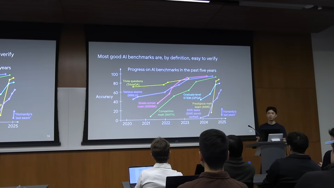 我们日常见到的大多数 AI 基准测试,其本质就是高度可验证的任务。这也就解释了为什么 AI 在这些 benchmark 上的表现突飞猛进。