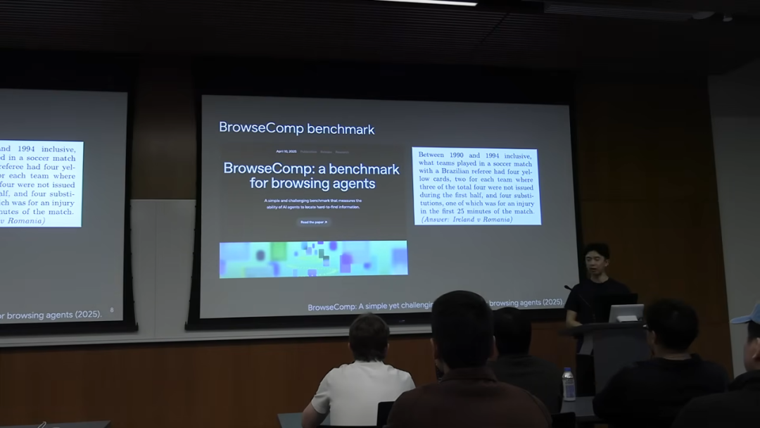 为了衡量这种能力,OpenAI 内部创建了一个名为 BrowseComp 的基准测试。这些问题通常答案一旦找到就很容易验证,但寻找过程却非常耗时。例如,根据一系列复杂的约束条件,找到一场特定的足球比赛。测试结果显示,人类解决这些问题平均需要超过两个小时,而且很多问题人类在两小时内根本无法完成。而 OpenAI 的 Deep Research 模型已经能解决其中近一半的问题。