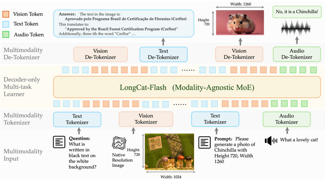 这次的 LongCat-Next 就是「原生全模态」的践行者,但说起来容易做起来难,想要真正将所有模态统一 tokenize,需要从架构到 infra 管线的全套创新。