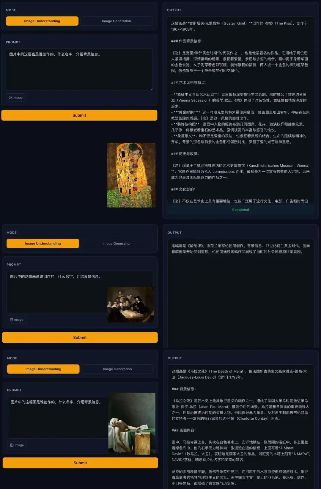 最近周杰伦发了新专辑,主打歌《太阳之子》的 MV 致敬了许多名画,我随便挑了 3 幅让 LongCat 识别,都能准确说出作者、画名和背景。