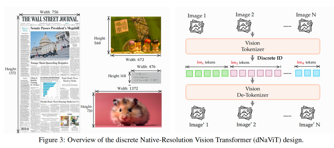 此外,dNaViT 还原生支持任意分辨率。它不像传统模型那样需要把输入图像粗暴地缩放或裁剪到固定尺寸,而是直接处理原始图像,这在处理长文档、复杂图表等对细节和长宽比极其敏感的任务时,具备降维打击的优势。