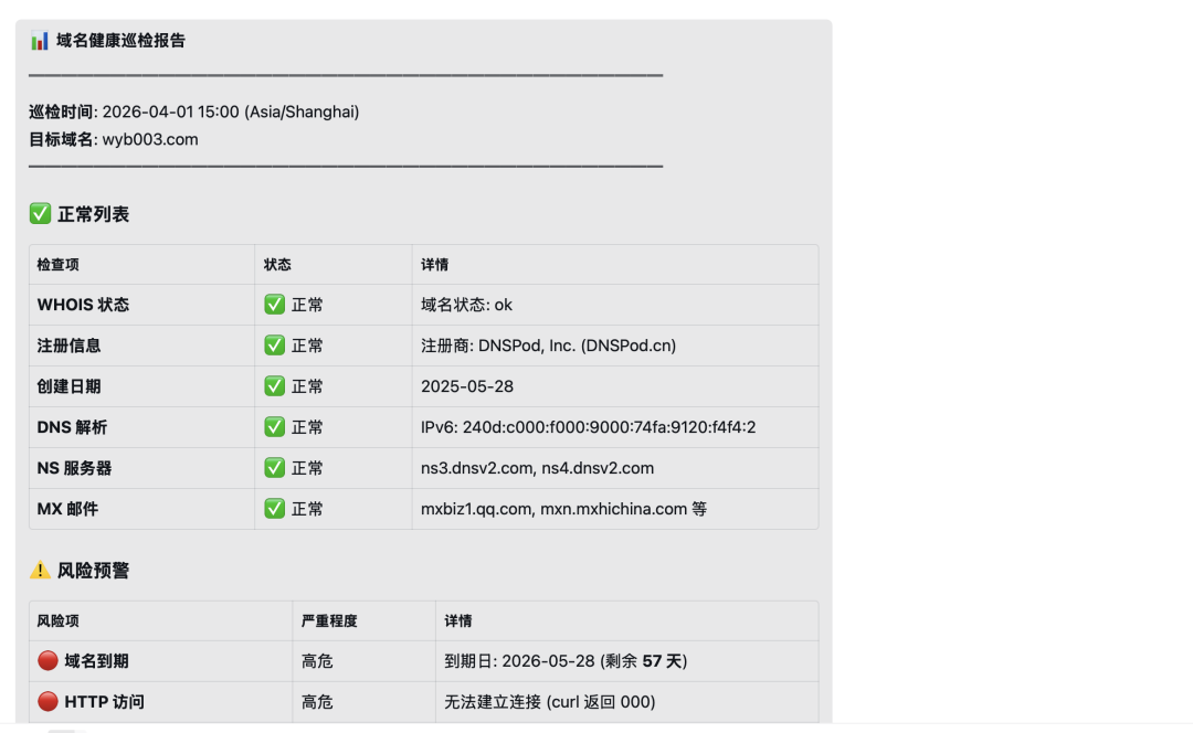 你是一个域名健康监控助手。请针对域名example.com执行以下精准巡检: