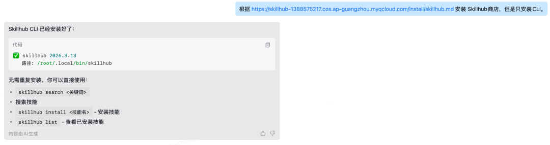 根据 https://skillhub-1388575217.cos.ap-guangzhou.myqcloud.com/install/skillhub.md 安装 Skillhub商店,但是只安装CLI