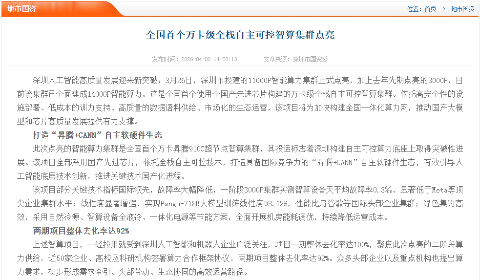 1、全国首个万卡级全栈自主可控智算集群点亮 -- 广东国资委-2026-04-02 https://gzw.gd.gov.cn/dsgz/szsgzw/content/post_4877940.html