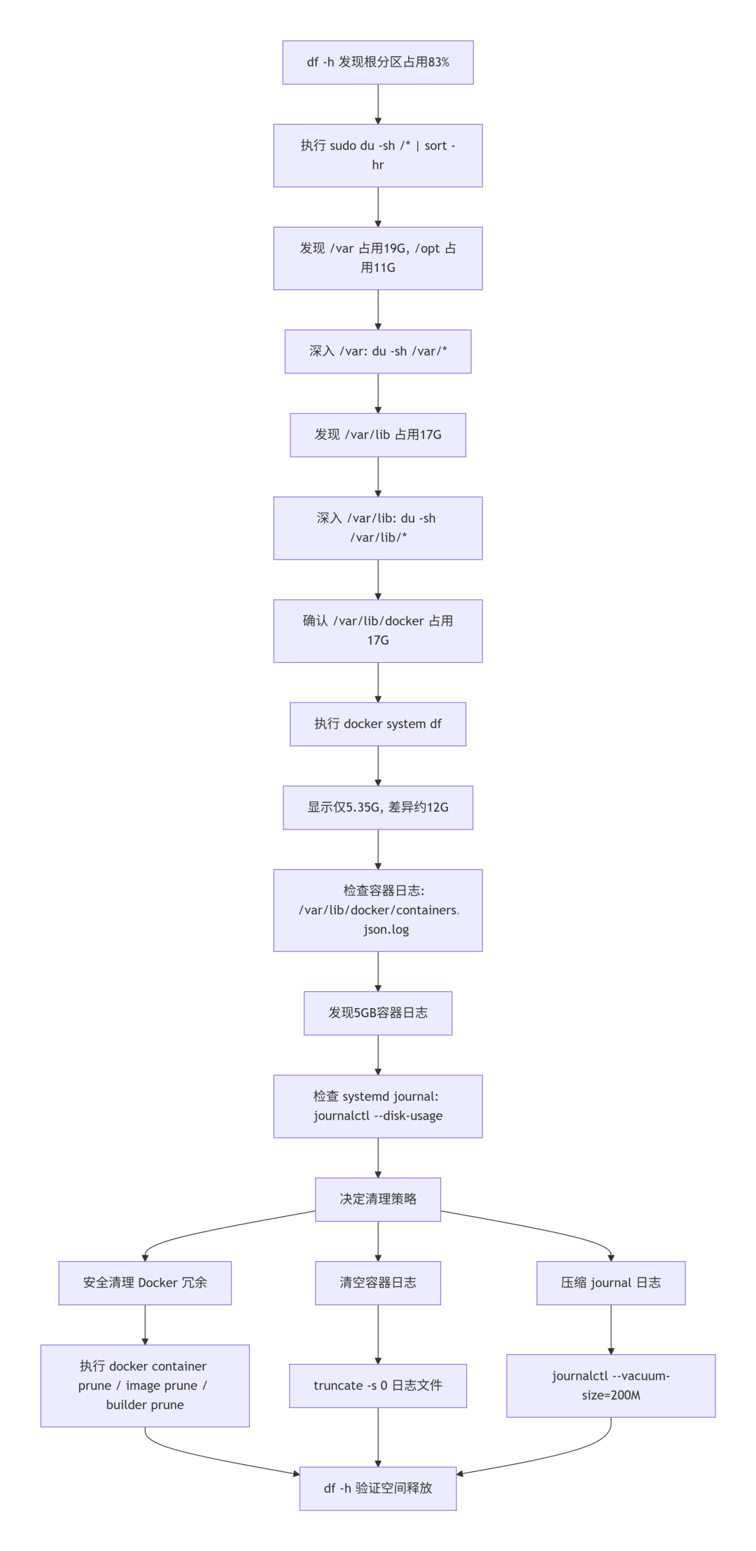 /var/lib/docker 与 docker system df 相差不大),可跳过 docker image prune -a 和 docker builder prune -a。journalctl --vacuum。/tmp 清理可根据需求调整保留时间。