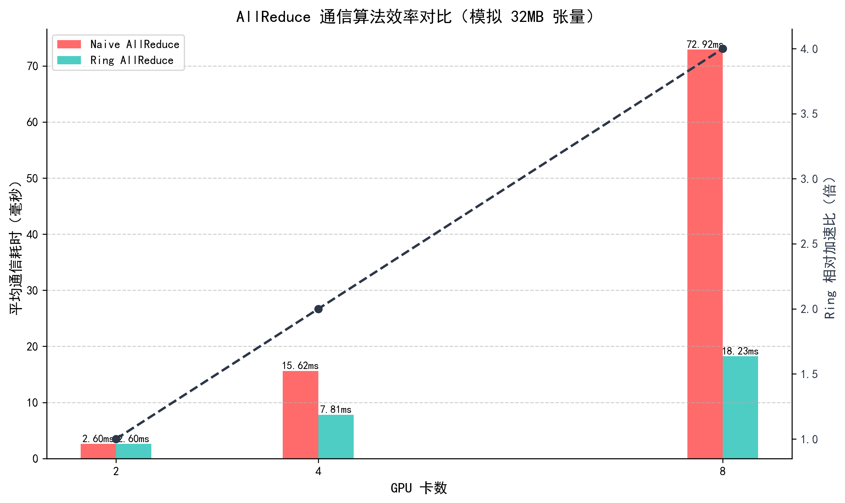 我们用torch.distributed模拟多卡环境下的Ring AllReduce与Naive AllReduce的效率对比,直观理解通信算法匹配的重要性;