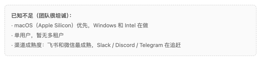 IM 渠道 | 需自行对接 ⚠️ | 视产品而定 ❌ | 内置微信、飞书、Slack、Discord ✅ |
