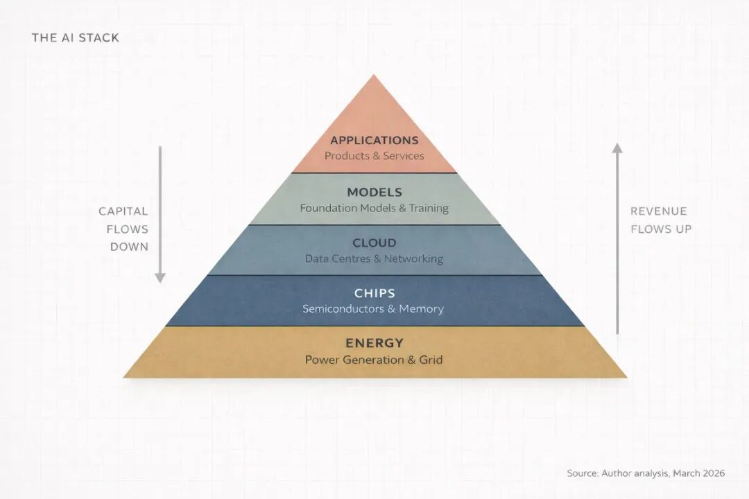 我把这一套称为 AI 堆栈(AI Stack)。五层叠在一起,每层为上一层提供养分,资金双向流动。