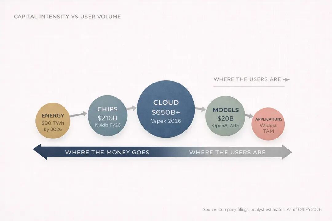 每一条 AI 新闻都变成了资本支出公告。每一次模型改进都变成了芯片订单。每一个新功能都变成了数据中心租赁。整个行业开始看起来像一系列同心圆,你越往圆心走,利润就越集中。