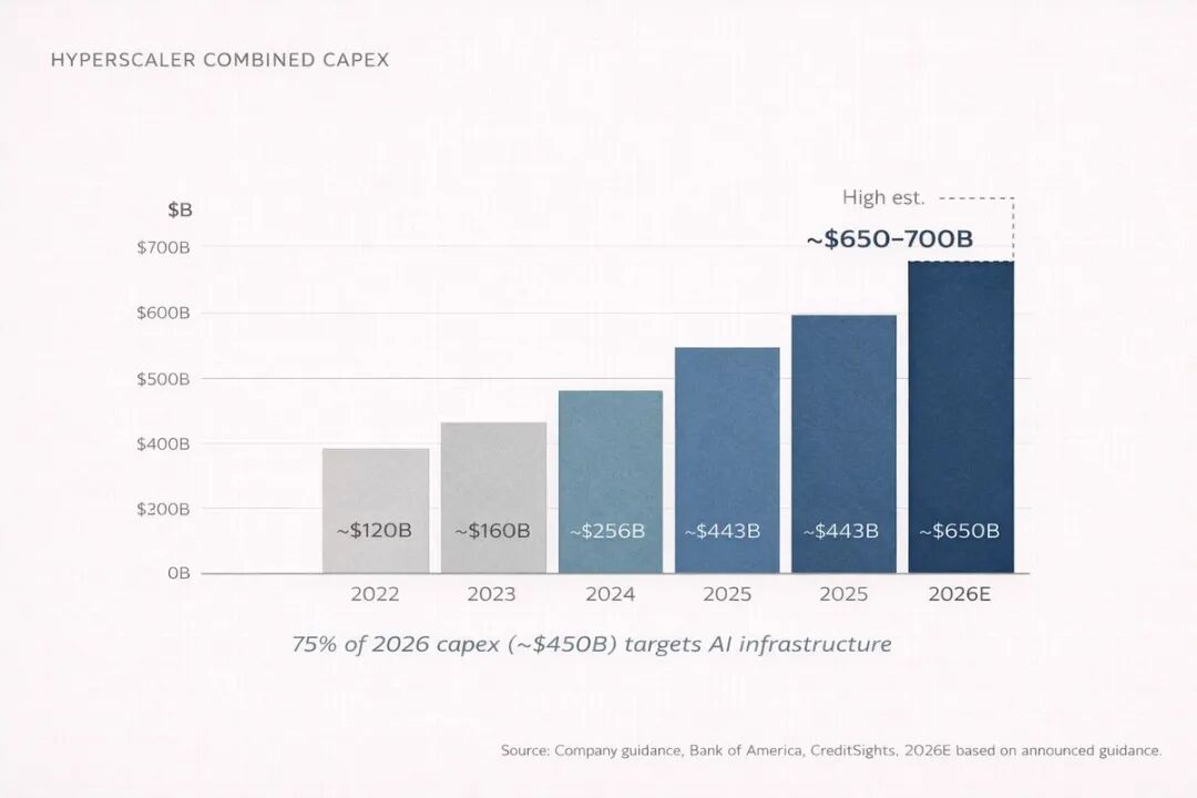 2026 年,四大云厂商(亚马逊、微软、Google 和 Meta)预计全年资本支出将达到 6500 亿至 7000 亿美元。加起来。在一年里。这个数字大约相当于瑞士的 GDP。其中约 75%——约 4500 亿美元——直接流入 AI 基础设施。