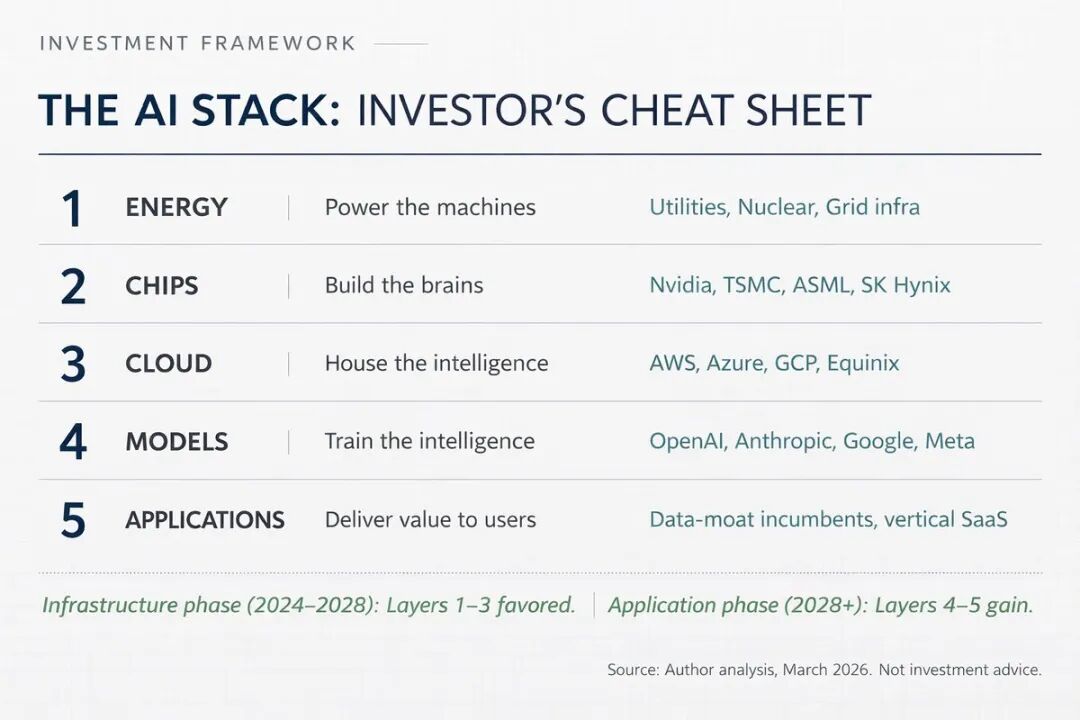 这篇文章会很长。如果你现在没时间,先收藏,回头再看。我想带大家完整走一遍 AI 价值链的每一层,从为数据中心供电的电力,到你手机上的应用程序,而且用一种即便你从未读过任何年报也能理解的方式。