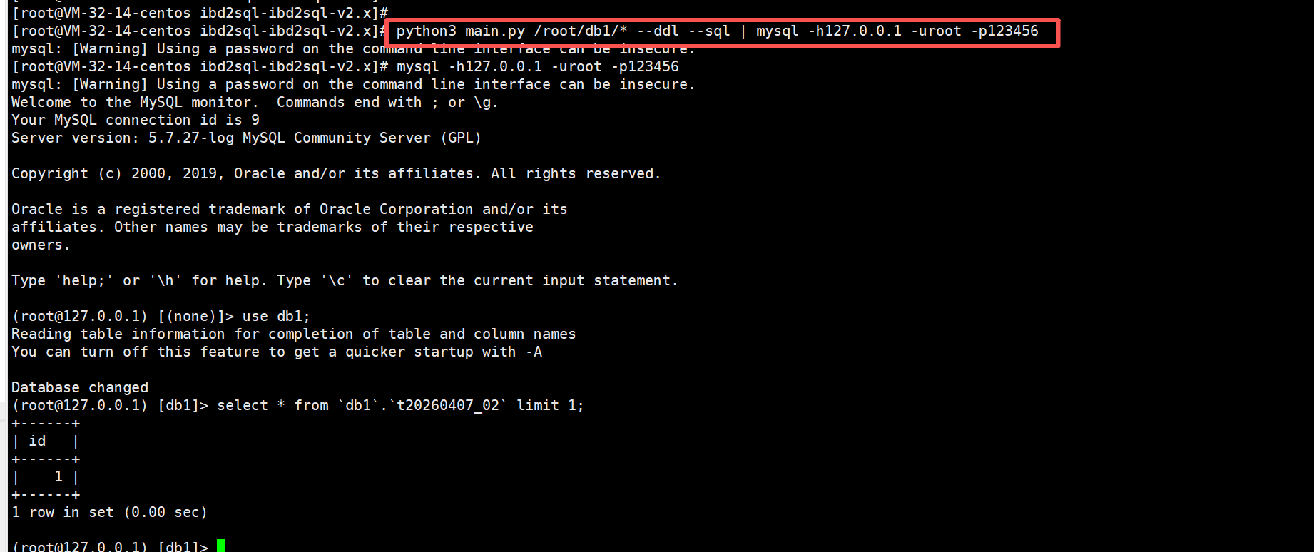 python3 main.py /root/db1/* --ddl --sql | mysql -h127.0.0.1 -uroot -p123456