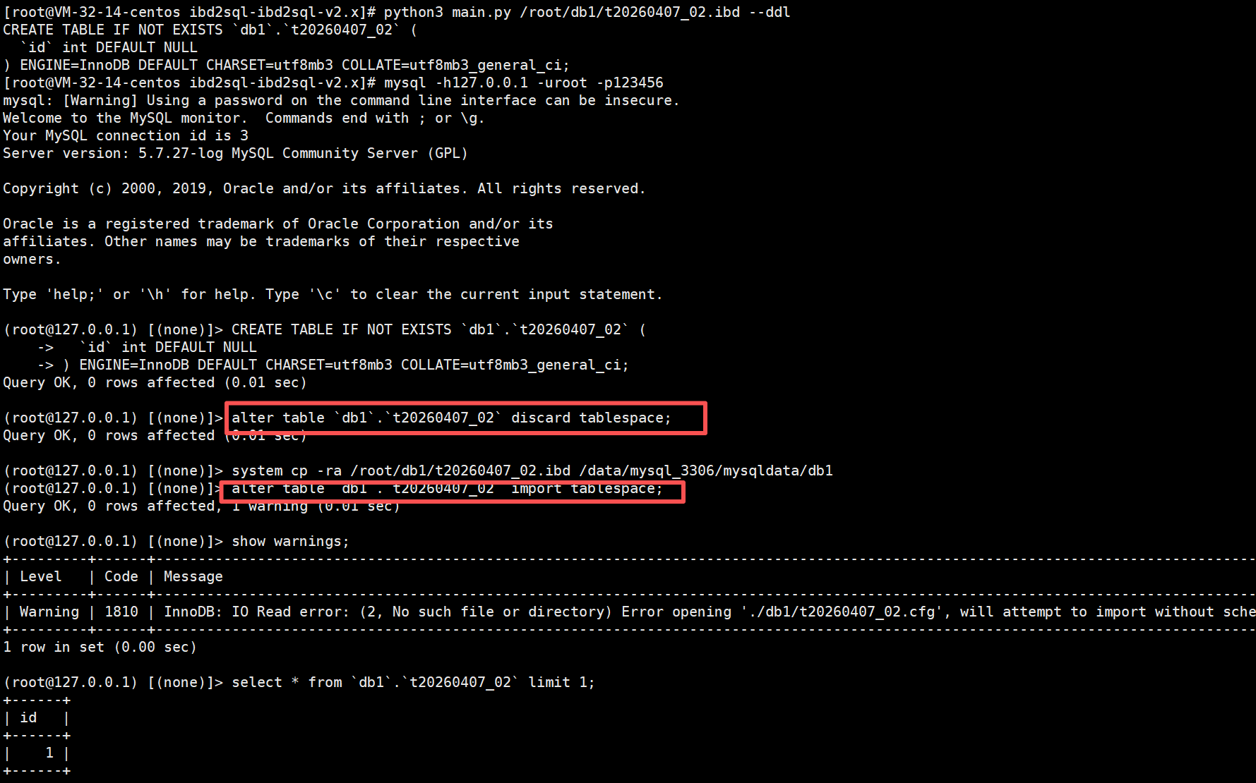 python3 main.py /data/mysql_3306/mysqldata/db1/*然后就是创建表并导入表空间了