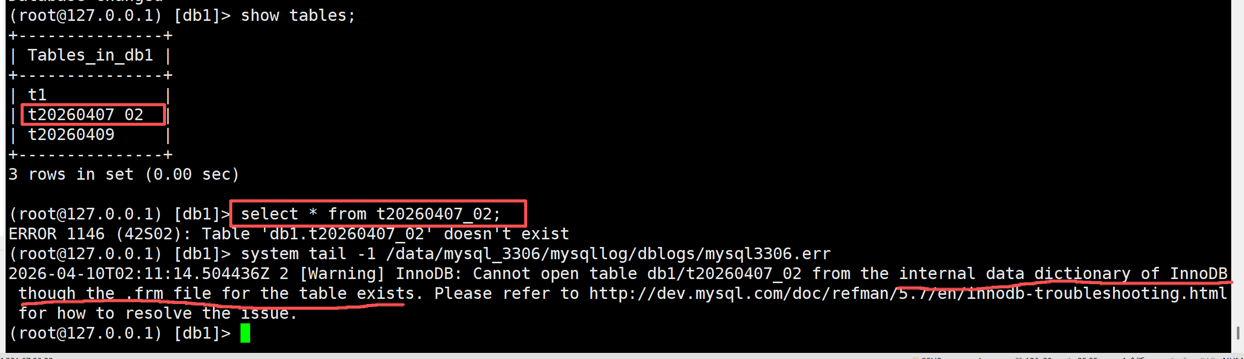 2026-04-10T02:02:49.557934Z 2 [Warning] InnoDB: Cannot open table db1/t1 from the internal data dictionary of InnoDB though the .frm file for the table exists. Please refer to http://dev.mysql.com/doc/refman/5.7/en/innodb-troubleshooting.html for how to resolve the issue.出现这样的报错, 通常表示数据库目录下存在相关的frm文件, 但是数据字典(ibdata1)中未记载相关表信息; 也就是说存在手动拷贝的frm文件到数据库目录下的操作.