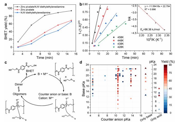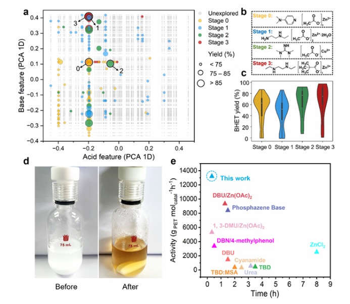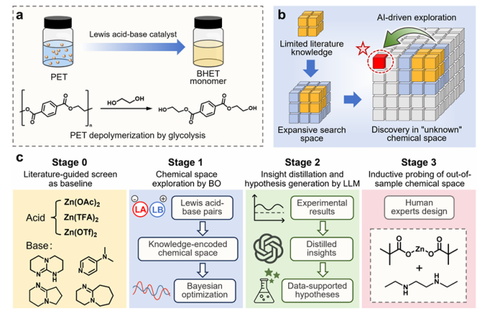 图1. AI加速发现Lewis酸碱催化剂用于PET乙二醇解。