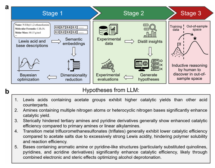 作者第0阶段通过已报道文献筛选多样化Lewis酸–碱组合建立性能基准,第1阶段利用贝叶斯优化在已知优选与未知空间之间高效探索,获取更丰富的数据;第2阶段借助大语言模型挖掘潜在结构–活性关系并生成可验证假设;第3阶段结合人类经验对AI结果进行拓展,提出超出原始搜索空间的新型催化剂。人机协同策略突破传统数据驱动优化的局限,实现从探索到推理再到创新发现的跃迁。(图1)