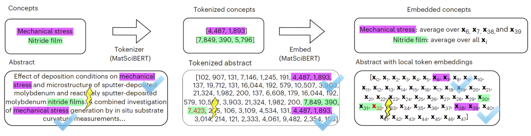 研究人员利用MatSciBERT生成概念嵌入,并通过降维方法构建“材料科学地图”。该地图显示,语义相似的概念在空间中自然聚集,验证了嵌入能够捕捉真实语义关系。此外,最近邻查询结果表明,模型能够识别语义上相关但文本形式不同的概念。