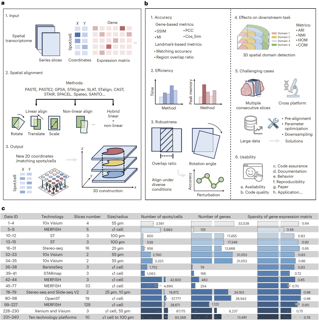 研究人员比较了11种主流空间对齐方法,这些方法大多以基因表达矩阵和空间坐标为输入,通过线性、非线性或混合变换实现切片对齐。最终输出通常为新的空间坐标或匹配点对,并将多个切片整合至统一三维空间。