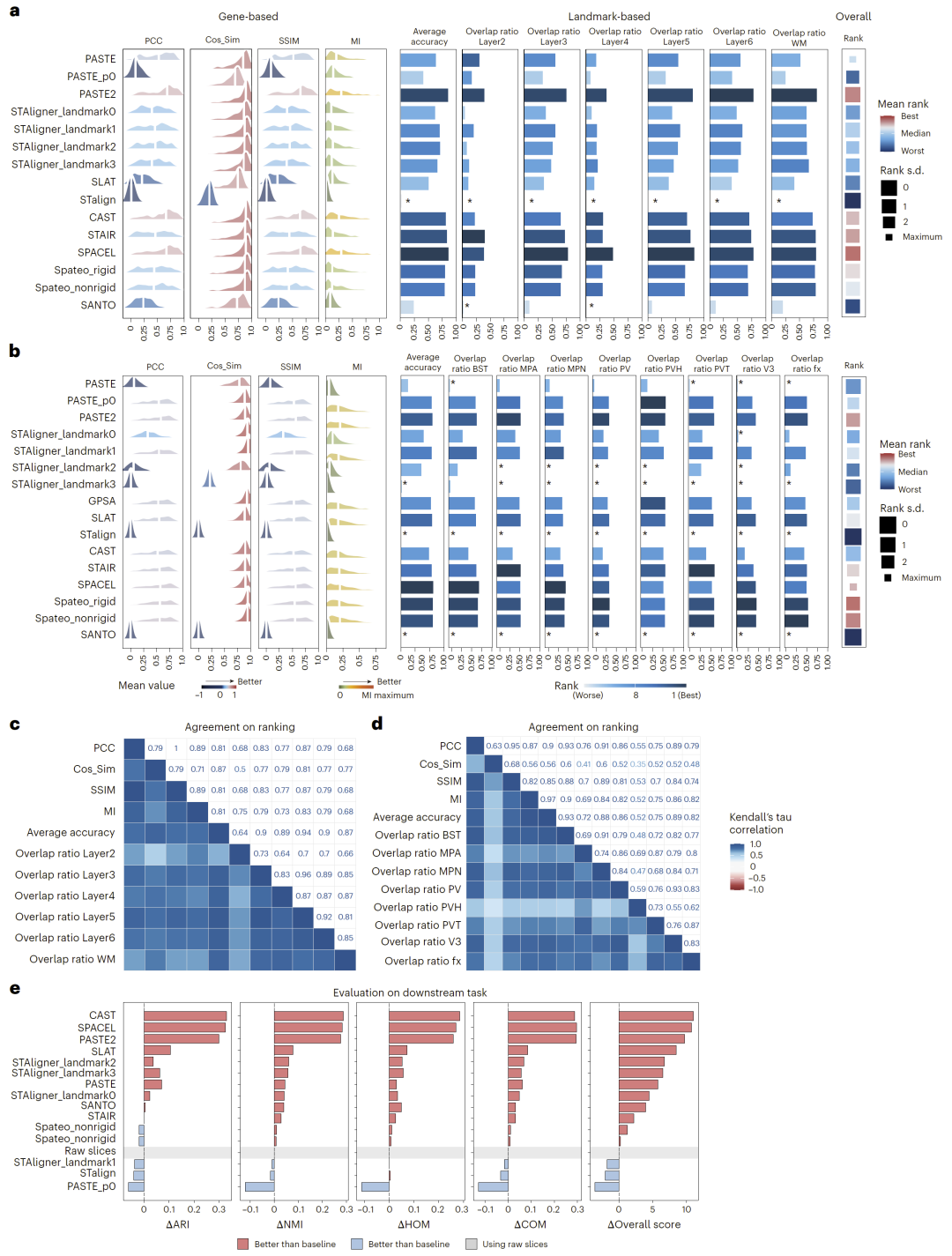 表现最佳的方法在多个评价指标上均明显优于未对齐数据,表明高质量的空间对齐对于后续生物学分析至关重要。因此,在实际分析流程中,应优先选择高性能对齐方法,以提升整体分析质量。