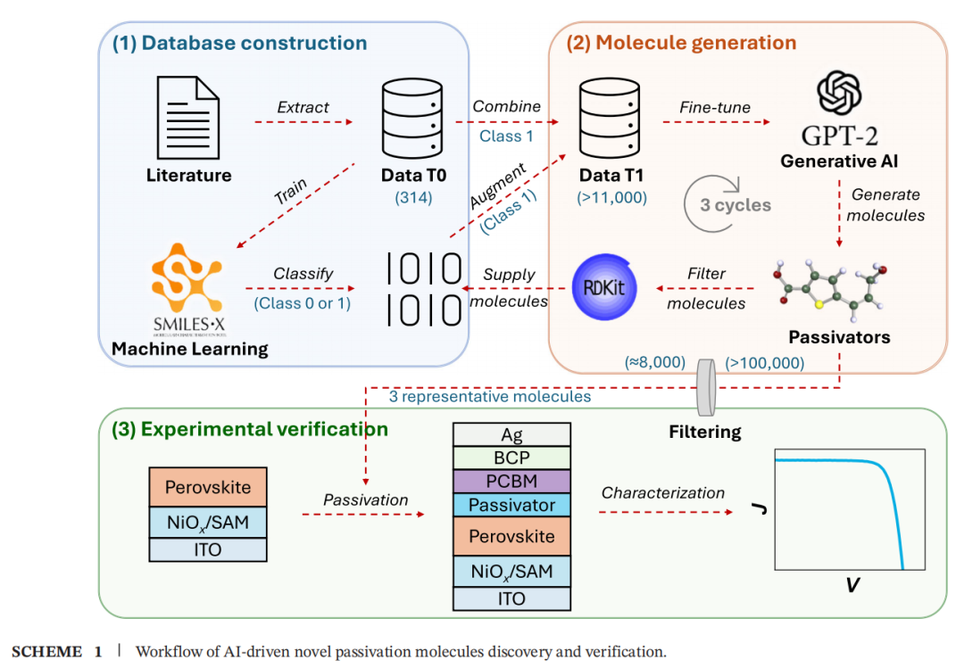 缺陷会导致载流子复合,拉低效率、降低寿命。科学家的解决思路是:在钙钛矿表面涂上一层"钝化分子",把缺陷堵住。听起来简单,但现实是——好用的钝化分子要靠人类专家凭经验一个个试,效率极低,能搜索的化学空间也极其有限。