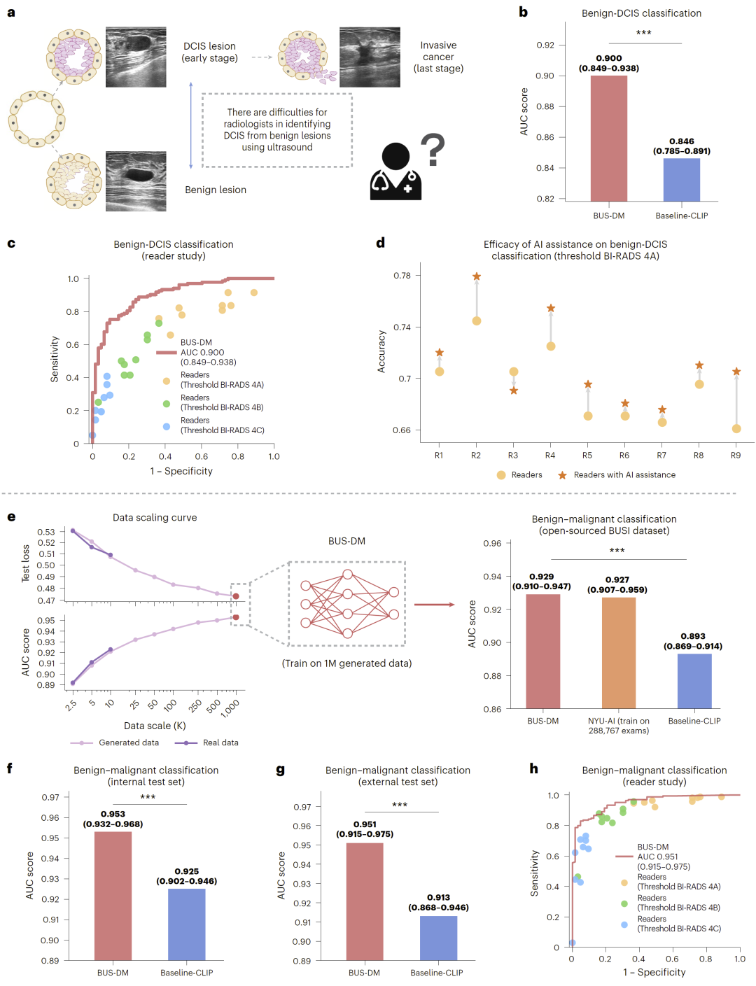 通过少样本适配,BUSGen能够生成高质量、任务特异的合成数据,从而支持多种下游任务模型的构建,包括乳腺癌筛查、早期诊断以及预后预测。实验结果表明,基于生成数据训练的模型在多个任务上显著优于传统基于真实数据训练的基础模型。在乳腺癌早期诊断任务中,该方法甚至超过了多名经验丰富的放射科医生,平均灵敏度提升达到16.5%。此外,研究人员还系统分析了生成数据的扩展效应,并证明该模型在隐私保护和数据共享方面具有重要优势。整体而言,该研究展示了生成式基础模型在医学影像领域的巨大潜力,为乳腺癌精准诊断提供了新的技术路径。