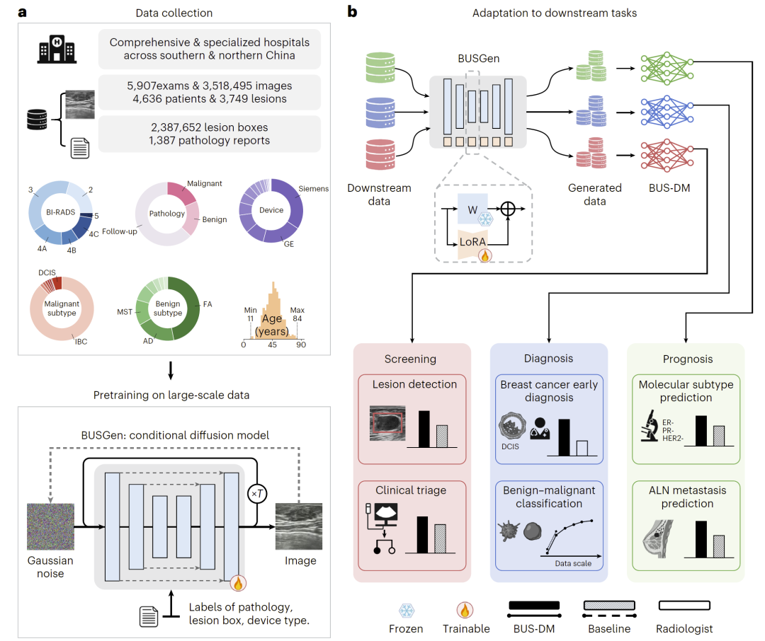 研究人员提出了首个面向乳腺超声影像分析的基础生成模型 BUSGen,该模型在超过350万张乳腺超声图像上进行预训练,学习了丰富的乳腺解剖结构、病理特征以及临床变异模式。