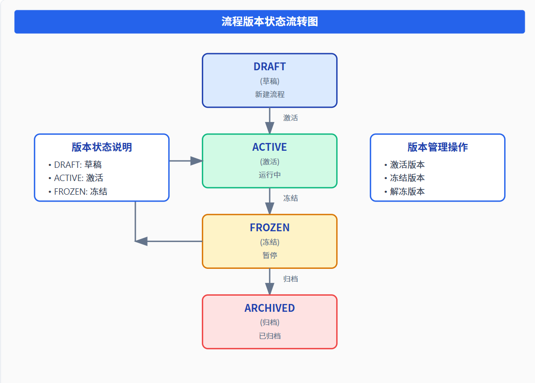 - 调度策略: 条件执行(根据请假天数)版本状态流转: