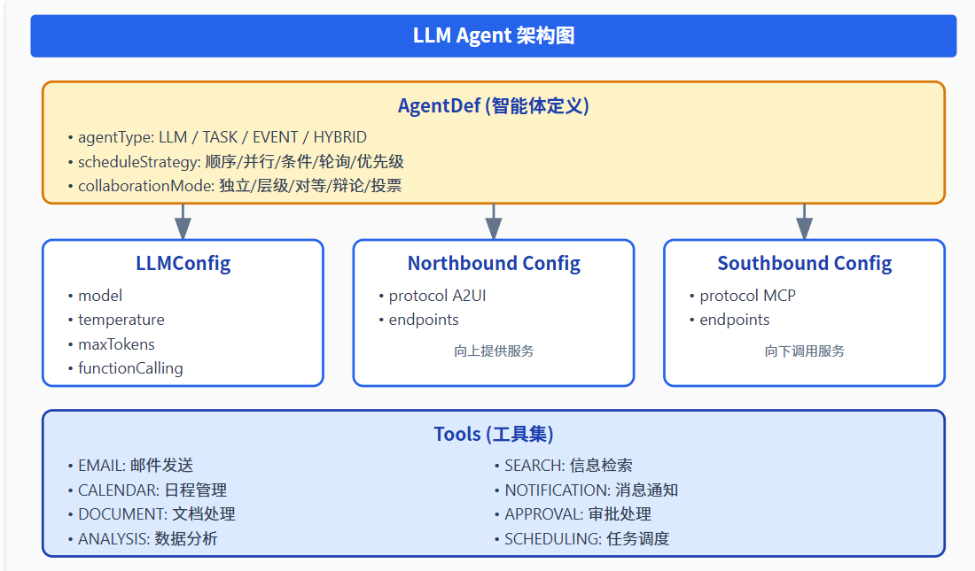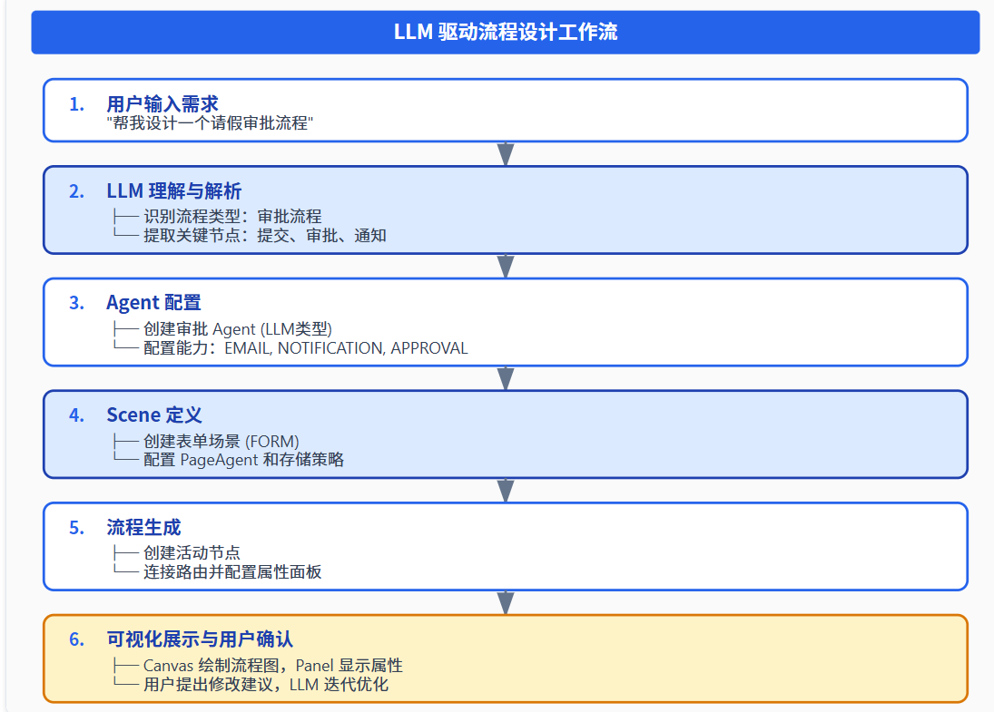 }LLM Agent 是整个系统的智能化核心,实现了AI 驱动的流程设计与优化。