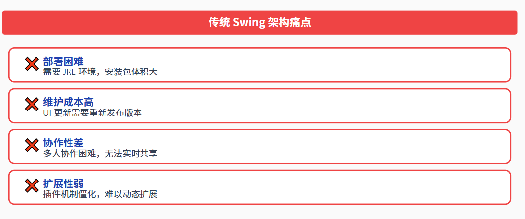 传统 Swing 桌面应用虽然稳定,但面临着以下挑战: